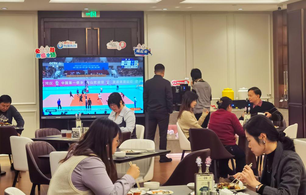11月20日,游客在广州一家餐厅内用餐,一旁的电视正转播全运会比赛。新华社记者洪泽华 摄